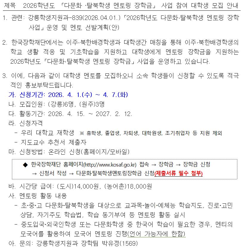 2026학년도 「다문화 ·탈북학생 멘토링 장학금」 사업 참여 대학생 모집 안내